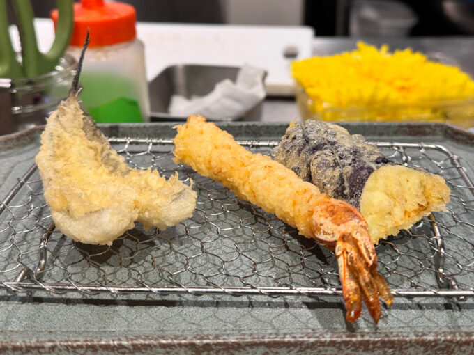 この日のちょい飲みセットの天ぷらは、海老、白身魚、茄子、さつまいも。
