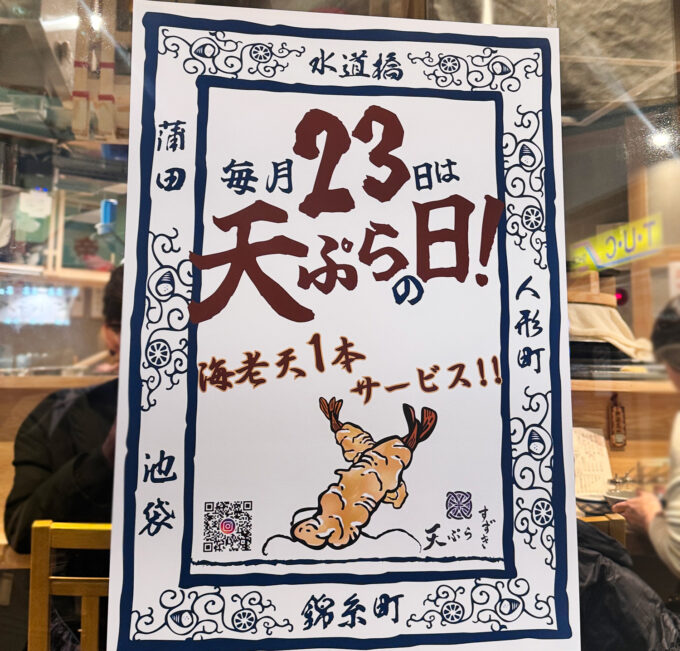 毎月23日は天ぷらの日で、海老天1本サービスだそうです✨