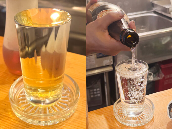 お酒は420円~でハウス焼酎はタカラ。生ビールはハートランドで、ラガー小瓶やクラフトビールのほか、チューハイ、ホッピー、梅割り、角ハイ、日本酒は菊正宗などが揃っています。