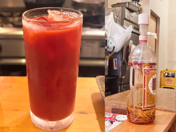 辛党におすすめなのが「辛トマトハイ」。タバスコ入りかと思いきや、使われているのは唐辛子を漬け込んだ唐辛子焼酎。