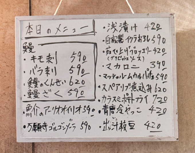 本日のメニューには、人気の鰻のくんせいをはじめ、鰻ざくや骨せんべい、鰻のキモ刺し、バラ刺しなどが並びます。さらに、旬の食材を使った洋風のおつまみも。