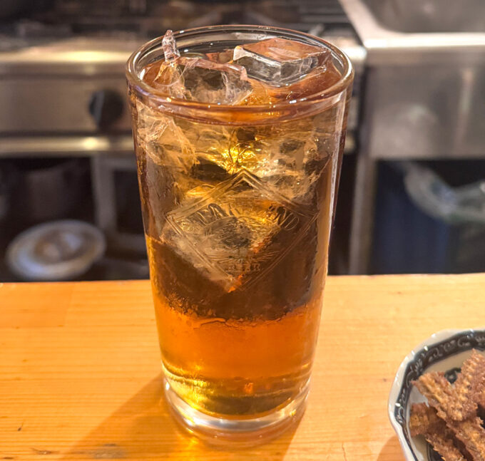「ゴボウコーン茶ハイ」は、ゴボウを漬け込んだ焼酎をコーン茶で割った一杯。