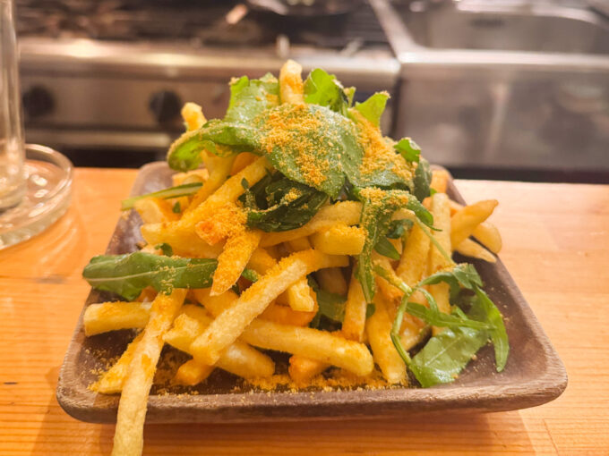 「カラスミポテトフライ」は、濃厚なカラスミに、ほろ苦いルッコラがいいアクセント。これがポテトフライとめちゃくちゃ合う!