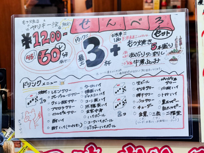 ドリンク最大3杯+名物1品の「せんべろセット(1200円)」からスタート。制限時間は60分!