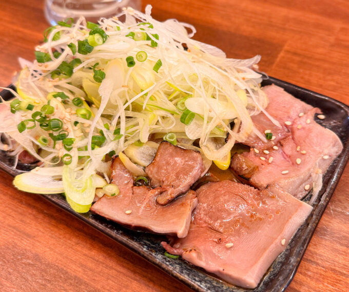 薄切りのあぶり豚タンが8切れほど、その上にきざみねぎがどっさり盛られています。これはテンション上がるなぁ✨