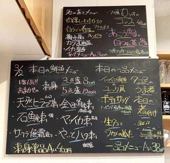 おつまみは日替りで、黒板には市場から仕入れた旬の鮮魚や一品料理が並びます。