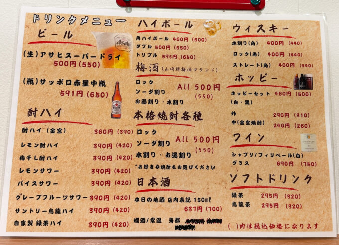 ビール(スーパードライ生・赤星中瓶)、サワー類・自家製緑茶ハイ、ホッピーセット、角ハイボール、日本酒、本格焼酎など一通りそろっています。