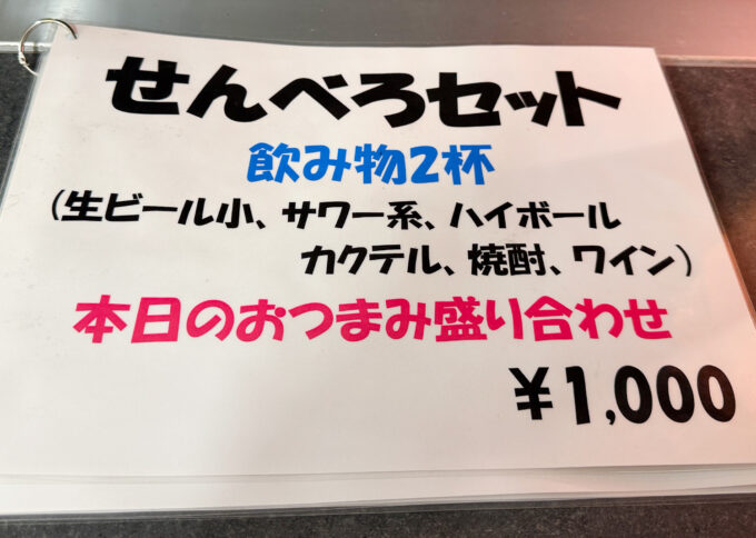 終日注文できる「せんべろセット」は、ドリンク2杯+本日のおつまみ盛り合わせで1000円。これはうれしい!