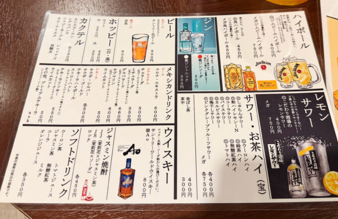 サワーや各種ハイボールをはじめ、ホッピーセットや赤星の瓶ビールも。カクテルに加え、コロナやテキーラ系などメキシカンドリンクまでそろう。