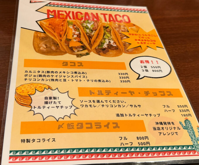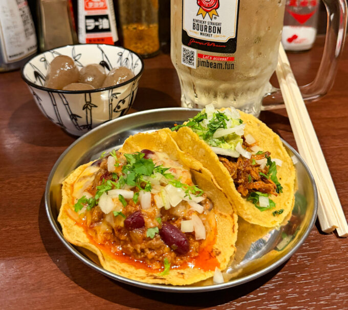 もともとは串揚げメインの店で、タコス好きが高じて今では看板メニューに。