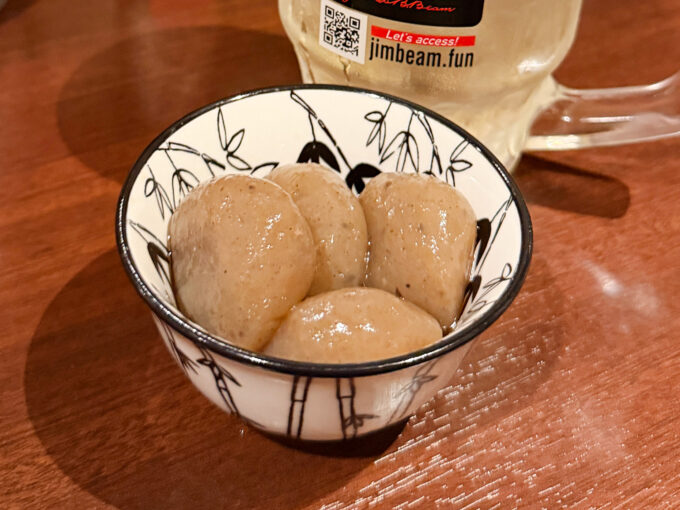 セットの本日の小皿は「玉こんにゃくの煮物」。プリプリもちもちでおいしい。