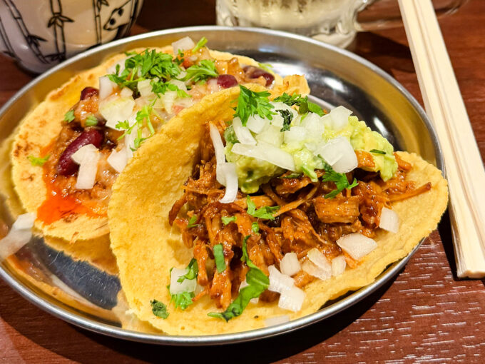 セットのタコス2種は選べるそうで、「チリコンカン」と常連さんにおすすめしてもらった「カルニタス」を。