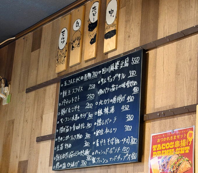 黒板には本日のおすすめメニューもあり150円から。素やきそばが気になる。