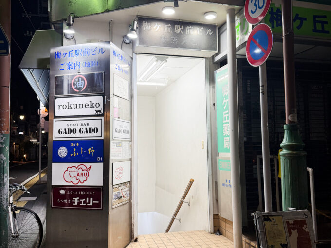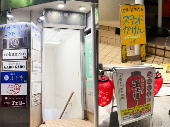 梅ヶ丘駅前ビルには地下飲食街があって、定食立ち飲みやもつ焼き酒場が入っていたりも。