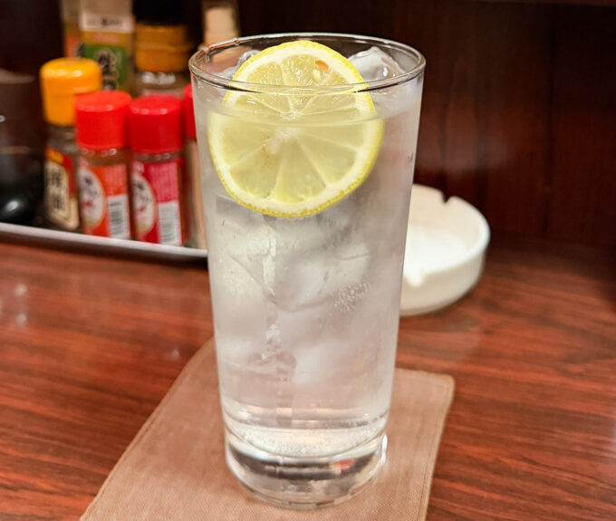 すると、焼酎はキンミヤ25度でレモンスライス入り。すっきりおいしくてテンション上がるなぁ。