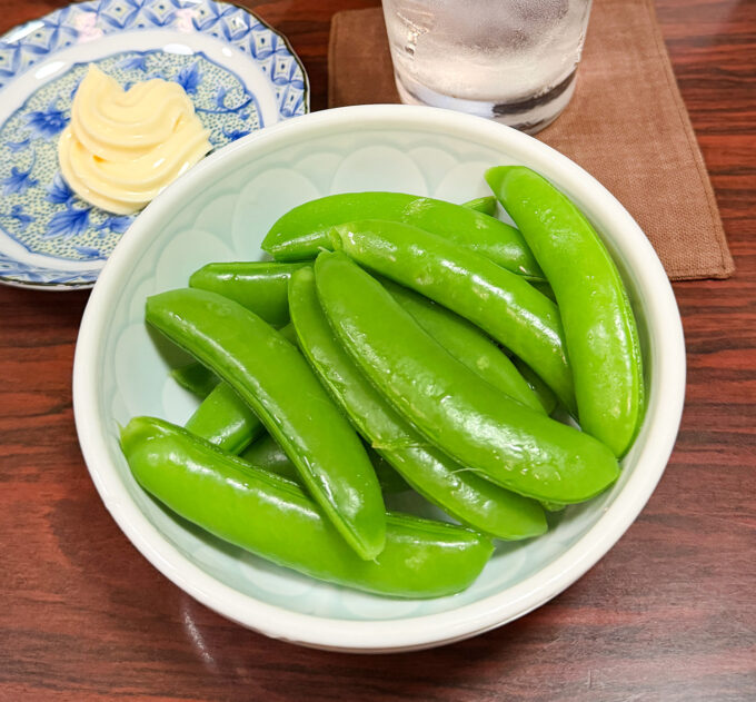 やきとんが焼けるまで「スナップエンドウ」をつまむとしよう。