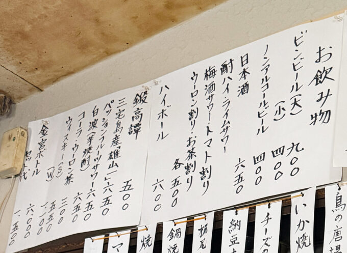 酎ハイやサワー類、日本酒、ハイボール、瓶ビール、白波や鍛高譚など本格焼酎など。