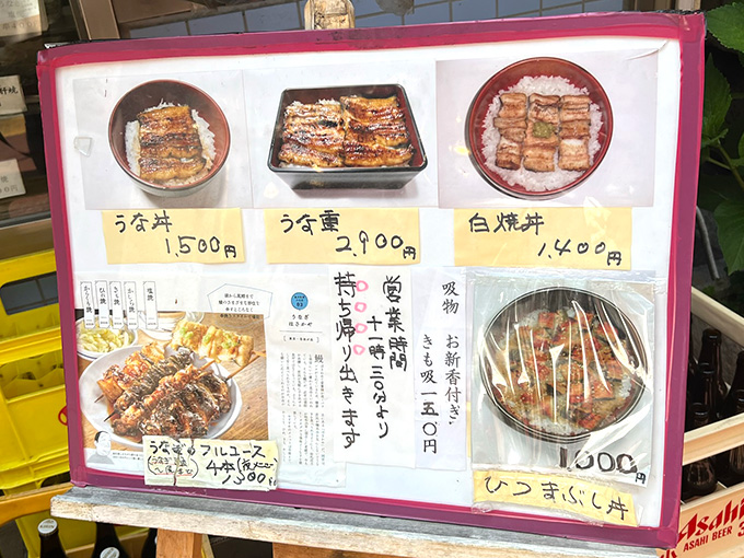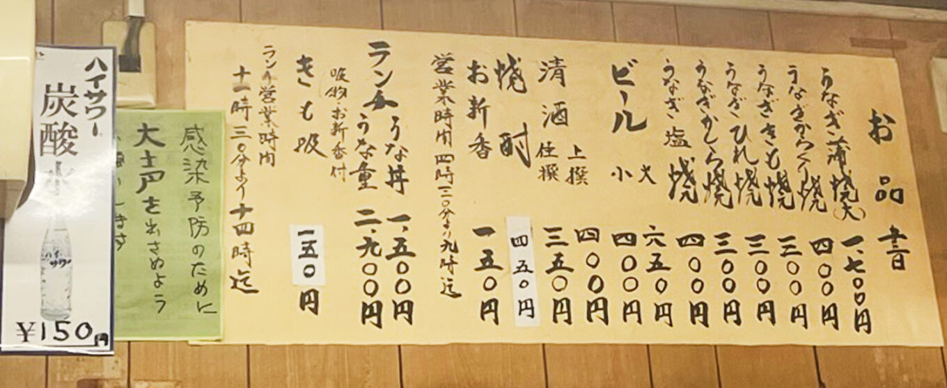 昼はうな重やうな丼などのランチ(メニューは限られますが昼飲みもできる)、夜は酒場としての顔に変わり、うな串や蒲焼などで一杯飲むことができます。