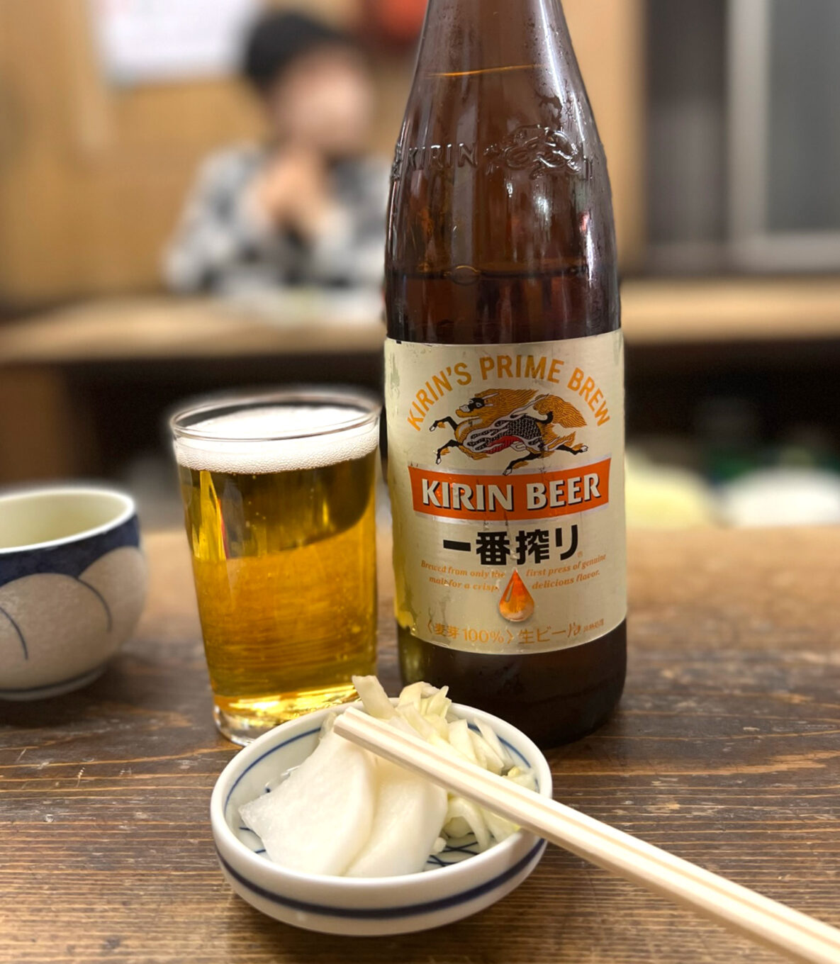 (キリン一番搾り大瓶650円・サービスのお新香)