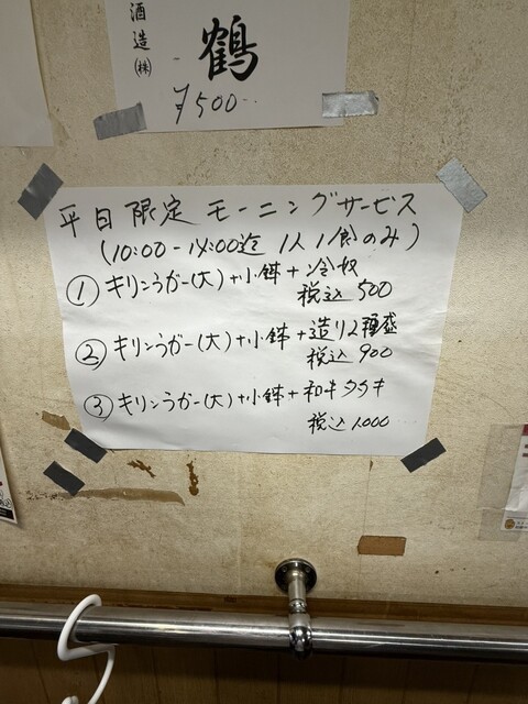 お酒は、ビール大瓶350円(キリンラガー、アサヒ)、生ビール中300円(アサヒ)、チューハイ類270円、ハイボール290円、日本酒260円~、焼酎250円~など。